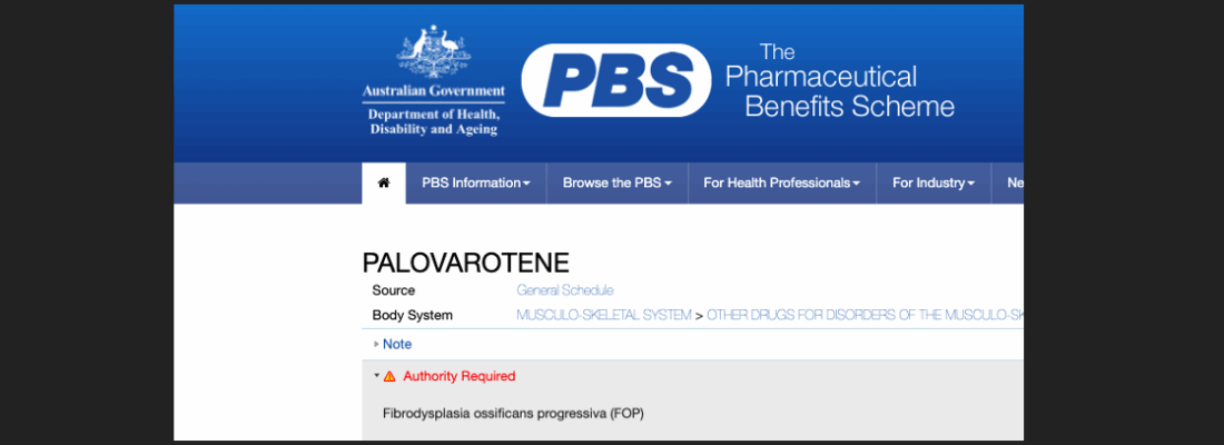 Today, 1st September, palovarotene becomes the first treatment available for Fibrodysplasia Ossificans Progressiva in Australia via the PBS (Pharmaceutical Benefits Scheme).