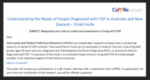 FOP Australia are excited to work with Community and Patient Preference Research (CaPPRe) on a project to better understand the needs of people living with Fibrodysplasia Ossificans Progressiva in Australia and New Zealand.