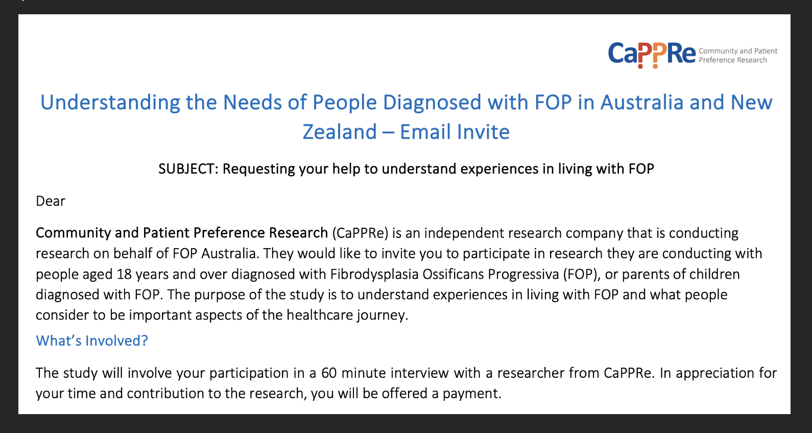 Email invitations are beinng sent out via FOP Australia (example in image below). If you are interested in finding out more about this study, and considering participating, let us know at info@fopaustralia.org and we will put you in touch with the research team.