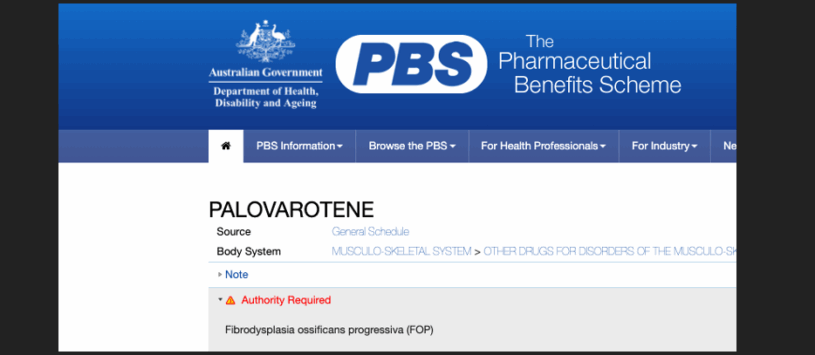 Today, 1st September, palovarotene becomes the first treatment available for Fibrodysplasia Ossificans Progressiva in Australia via the PBS (Pharmaceutical Benefits Scheme).